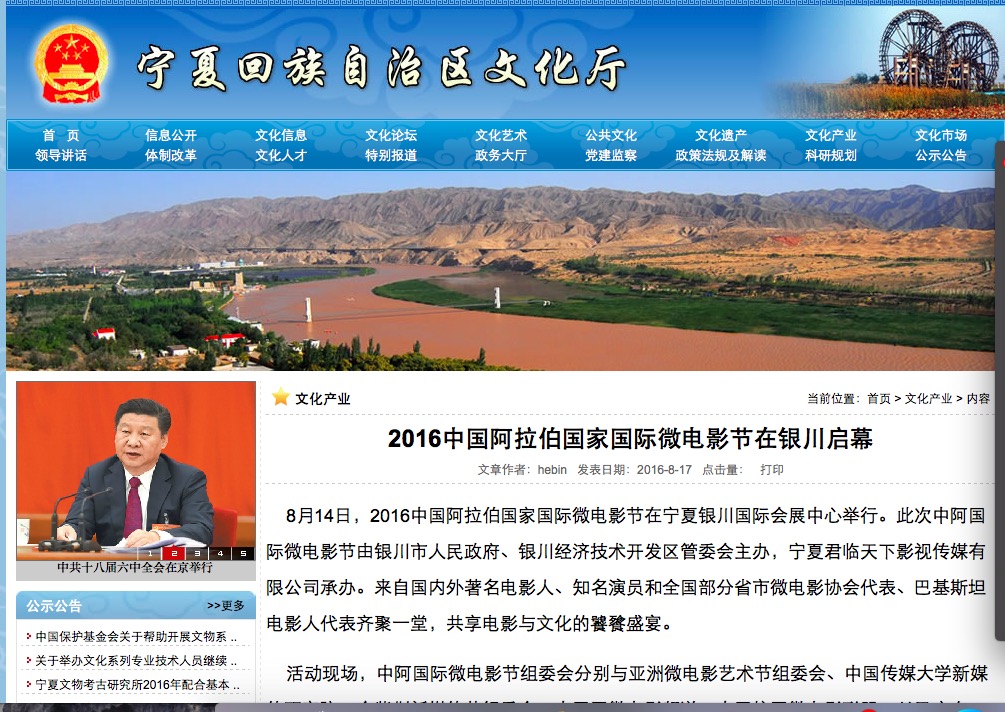 8月14日,2016中國(guó)阿拉伯國(guó)家國(guó)際微電影節(jié)在寧夏銀川國(guó)際會(huì)展中心舉行。此次中阿國(guó)際微電影節(jié)由銀川市人民政府、銀川經(jīng)濟(jì)技術(shù)開(kāi)發(fā)區(qū)管委會(huì)主辦,寧夏君臨天下影視傳媒有限公司承辦。來(lái)自國(guó)內(nèi)外著名電影人、知名演員和全國(guó)部分省市微電影協(xié)會(huì)代表、巴基斯坦電影人代表齊聚一堂,共享電影與文化的饕餮盛宴。